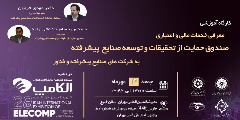 این کارگاه روز جمعه ۴ مهرماه از ساعت ۱۳:۰۰ الی ۱۳:۴۵ در نمایشگاه بینالمللی تهران، سالن خلیج فارس (۴۴B)، طبقه دوم، غرفه شماره ۵۲ با حضور دکتر مهدی فربیان، عضو هیأت مدیره صندوق حمایت از تحقیقات و توسعه صنایع پیشرفته و مهندس حسام خانکشیزاده، مدیر فنی صندوق